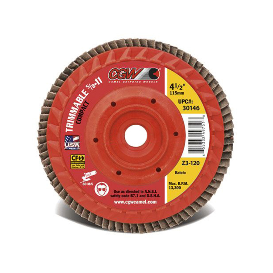 This is a CGW Abrasives flap disc, ceramic material, plastic backed, 6" x 5/8-11 thread. This abrasive disc is used for aggressive material removal, grinding, and blending on various surfaces, offering durability and high performance.