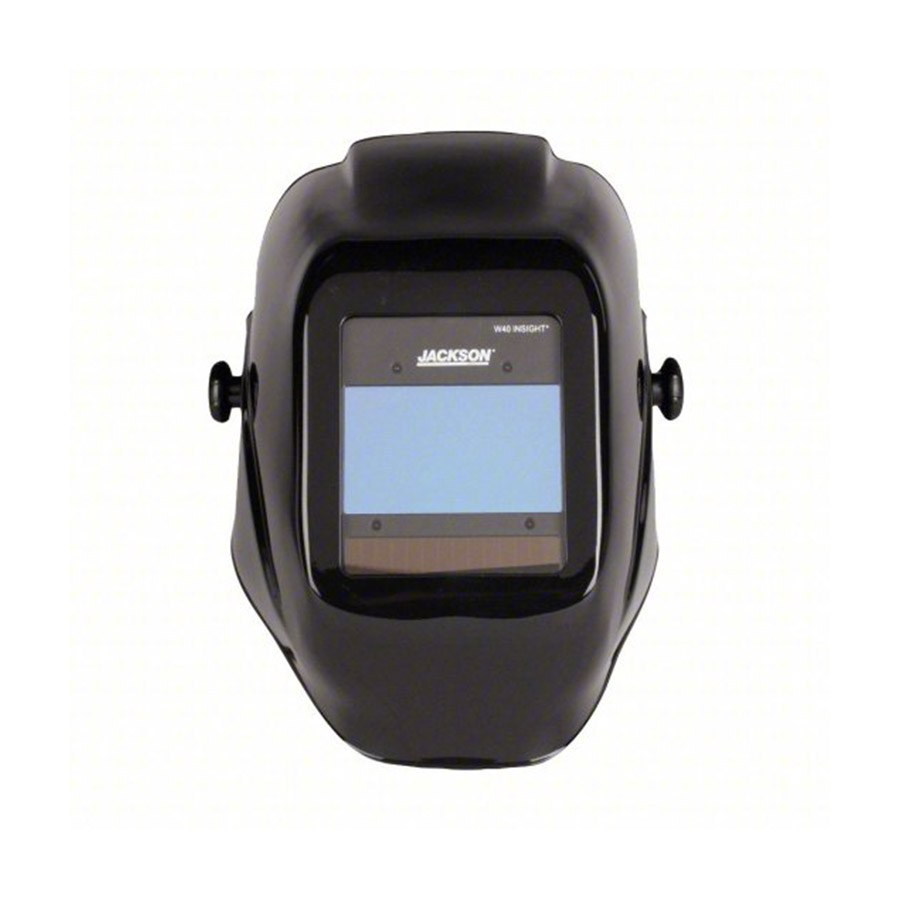 This is a Jomac auto-dark weld helmet. This welding helmet automatically darkens the lens upon arc ignition, providing continuous protection for the welder's eyes and face.