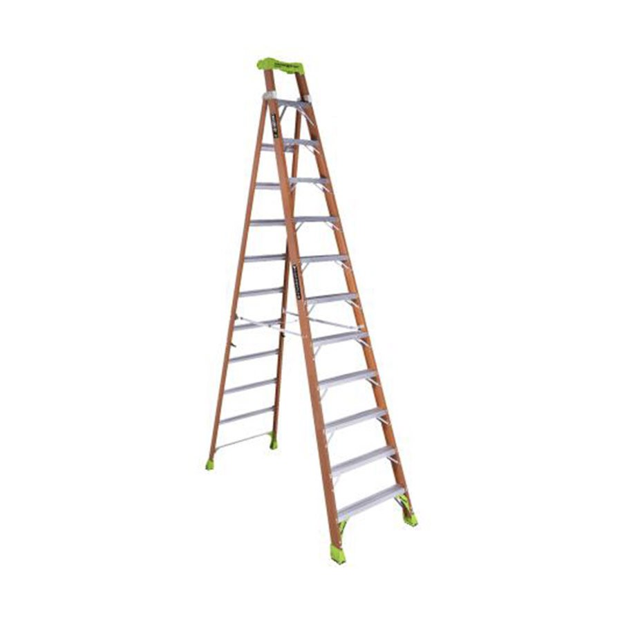 This is a Louisville Ladder cross-step 12' step ladder, #300LB. This very tall fiberglass step ladder is designed for high-reach tasks where a stable, wide platform is needed, offering safety and convenience.