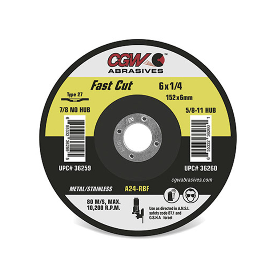 This is a CGW Abrasives grinding wheel, depressed center, 6" x 1/4" x 7/8", Type 27. This grinding wheel is suitable for aggressive material removal, beveling, and shaping on metal surfaces, with the depressed center for improved access.