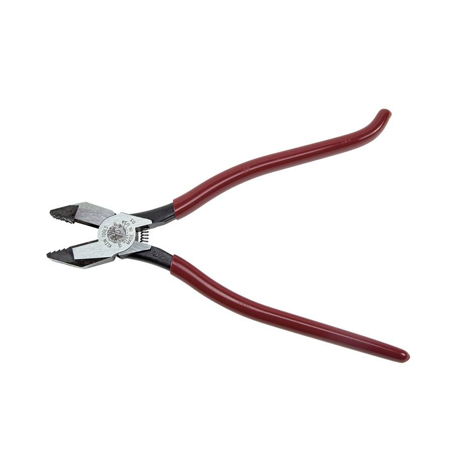 This is a Klein ironworkers pliers, aggressive knurl, red handle. These pliers are specifically designed for ironworkers, featuring an aggressive knurled jaw for secure gripping and cutting of rebar tie wire.