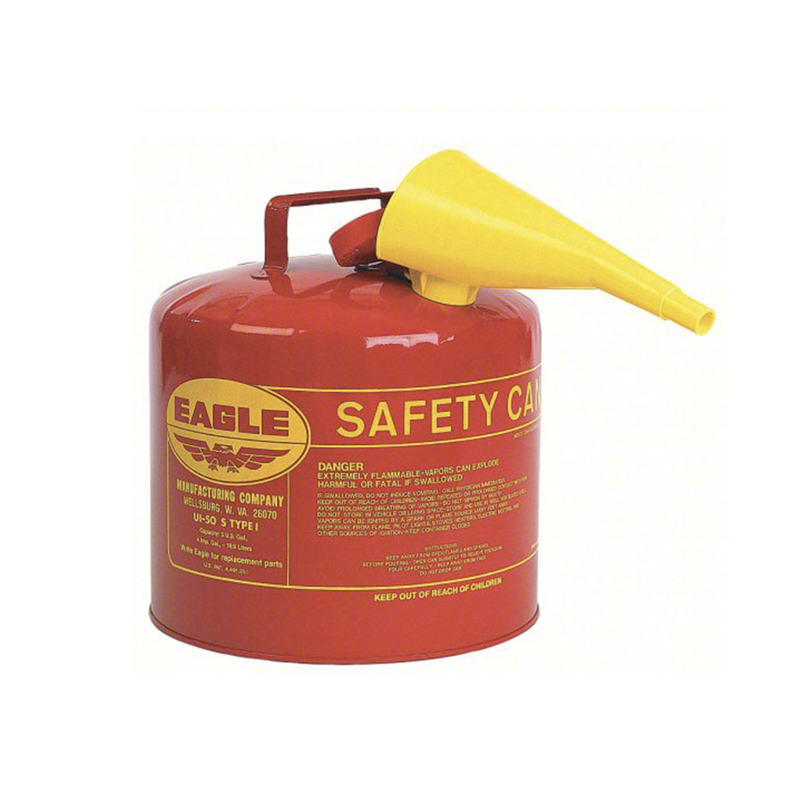 This is an Eagle safety can, Type 1, red, 5-gallon, with funnel. This larger safety can provides secure storage and dispensing of flammable liquids, meeting safety regulations for industrial use.